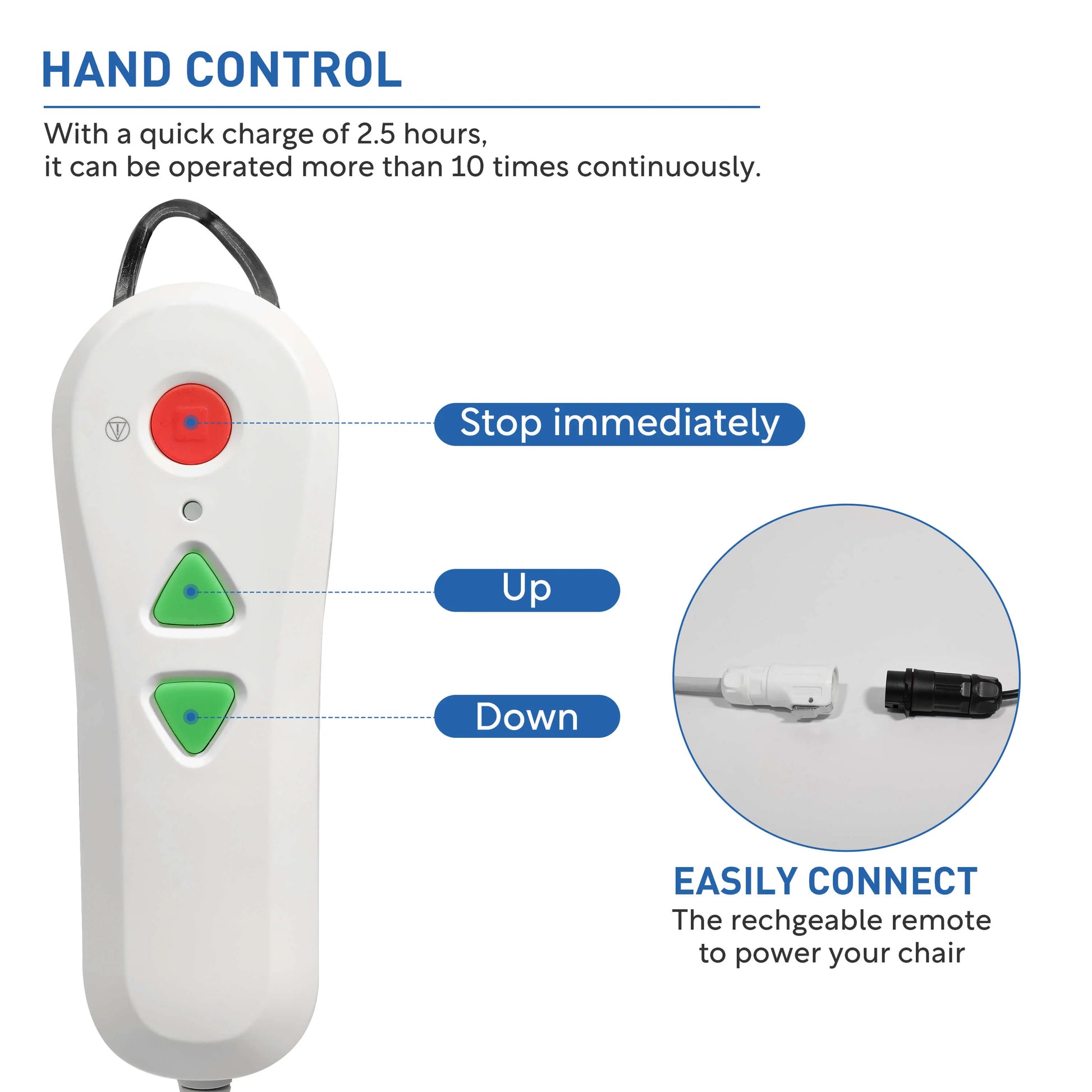 2.5H can be fully charged and can be used 8~10 times. If the battery drops to 20%, the controller will flash a small blue light. The indicator light will not light up when the controller is charging